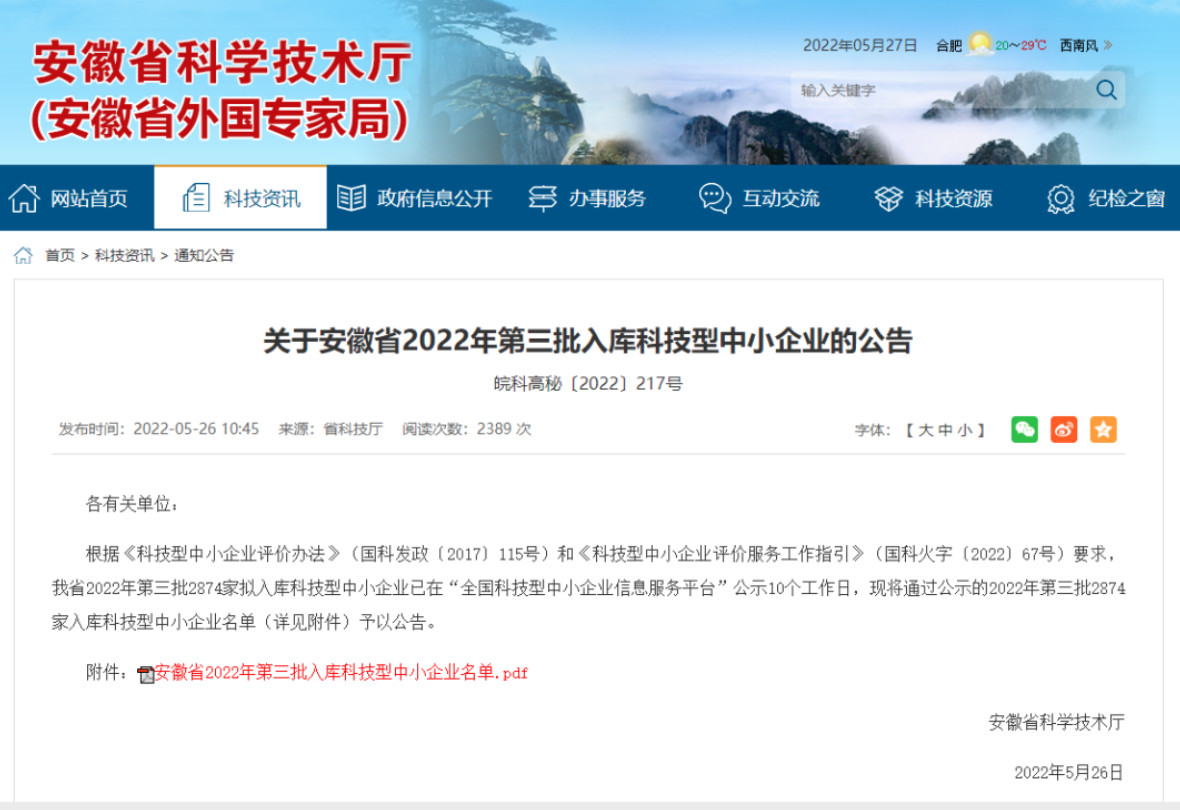5月26日,安徽省科技廳公示了2022年第三批擬入庫科技型中小企業(yè)名單,園區(qū)安徽海萃工業(yè)制劑有限公司和安徽軒架網(wǎng)絡(luò)科技有限公司兩戶企業(yè)成功入庫。