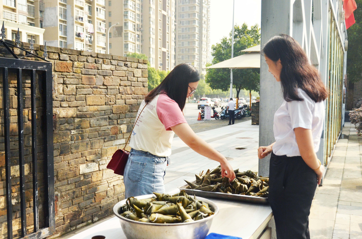 工作人員為園區(qū)小伙伴發(fā)放粽子
